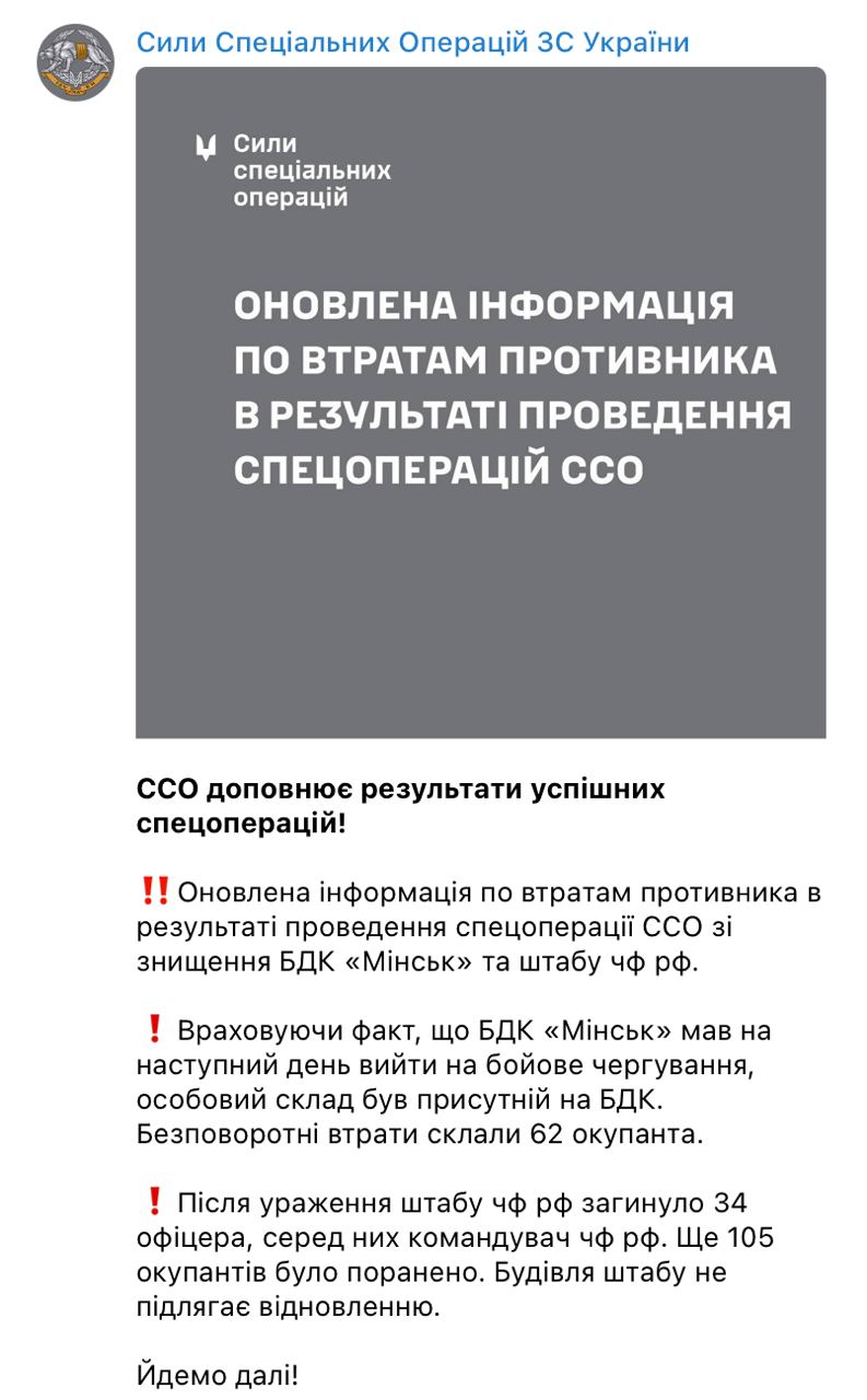 Як стверджують Сили спецоперацій України, всього загинуло 34 офіцери, поранено 105.