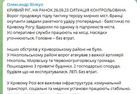 07:40 Голова військової адміністрації Кривого Рогу Олександр Вілкул написав, що попередньо били балістичними ракетами.