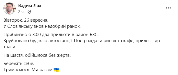 У ніч проти вівторка, 26 вересня, російські окупанти обстріляли Слов'янськ. Зруйновано будівлю автостанції, постраждали ринок та кафе.