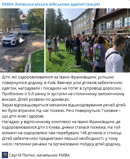 Діти, які оздоровлювалися на Івано-Франківщині, коли в комплексі, де вони знаходилися, сталася пожежа, успішно повернулися додому, до Києва.