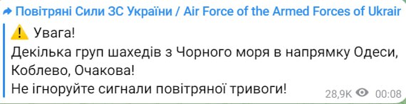 Вночі, 28 вересня, кілька груп "Шахедів" летіли з боку Чорного моря у напрямку до Одеси, Коблево, Очакова.
