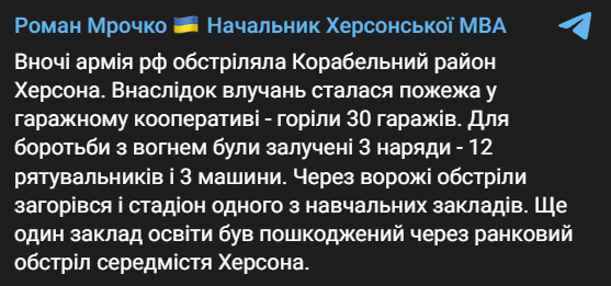 "В результаті пожеж сталася пожежа в гаражному кооперативі - горіли 30 гаражів. Для боротьби з вогнем було залучено 3 наряди – 12 рятувальників та 3 машини. Через ворожі обстріли спалахнув і стадіон одного з навчальних закладів. Ще один навчальний заклад був пошкоджений через-- через ранкові обстріли центру Херсона", - написав Мрочко.