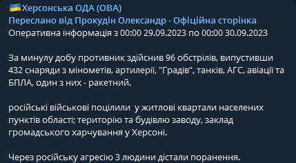 Також голова Херсонської ОВ Олександр Прокудін повідомив за минулу добу РФ здійснила 96 обстрілів, випустивши 432 снаряди з мінометів, артилерії, "Градів", танків, АГС, авіації та БПЛА, один із них – ракетний.