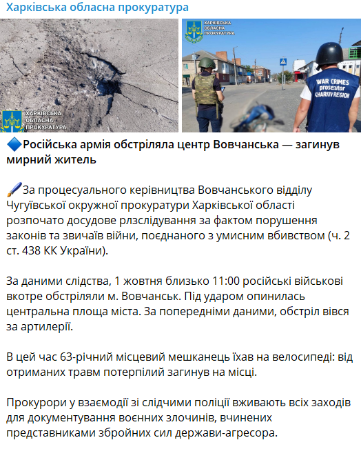 За даними слідства, 1 жовтня близько 11:00 російські військові вкотре обстріляли Вовчанськ. Під ударом опинилася центральна площа міста. За попередніми даними, обстріл провадився з артилерії.