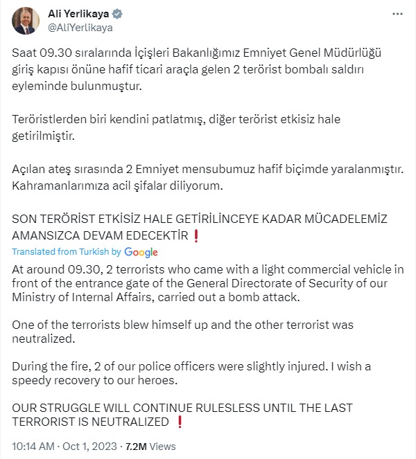 Про це повідомив у соцмережі X глава МВС Алі Єрлікая. Кадри теракту оприлюднюють турецькі ЗМІ.