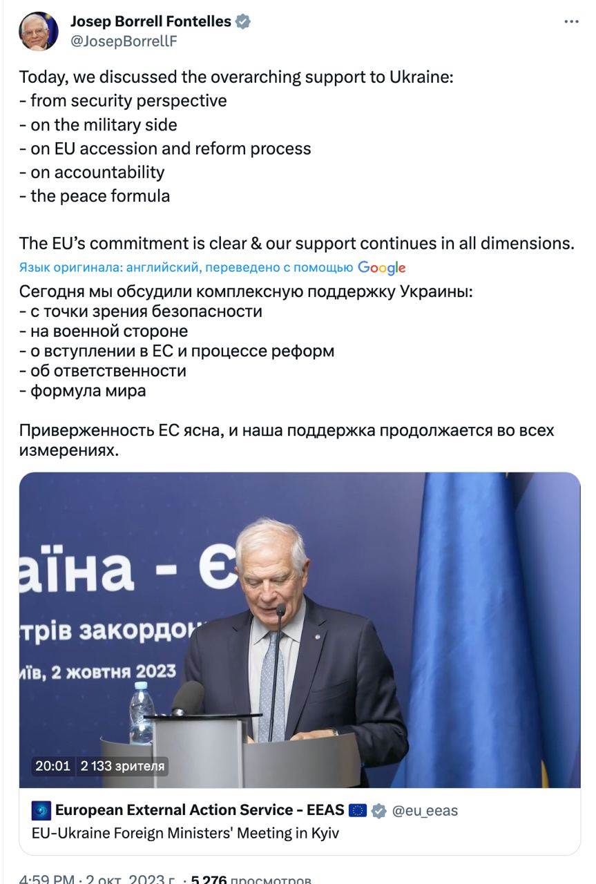 Раніше глава зовнішньополітичної служби Євросоюзу Жозеп Боррель говорив, що припинення військової підтримки Києва з боку Заходу призведе до швидкого закінчення конфлікту в Україні, проте країна втратить свою незалежність.