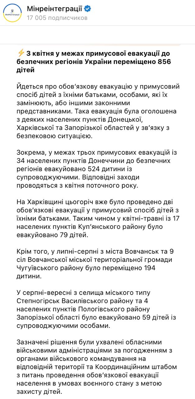 09.20 З квітня із прифронтових регіонів примусово переселили 856 дітей, повідомляє Мінреінтеграція.