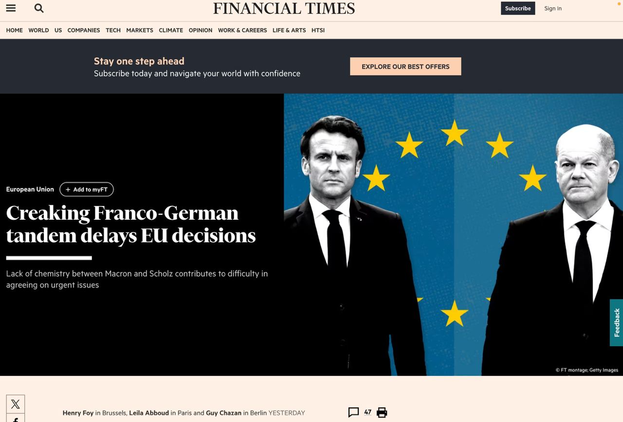 Видання пише про "відсутність консенсусу всередині франко-німецького тандему, який лежав в основі ухвалення рішень ЄС". Ця напруженість зберігається вже понад рік.