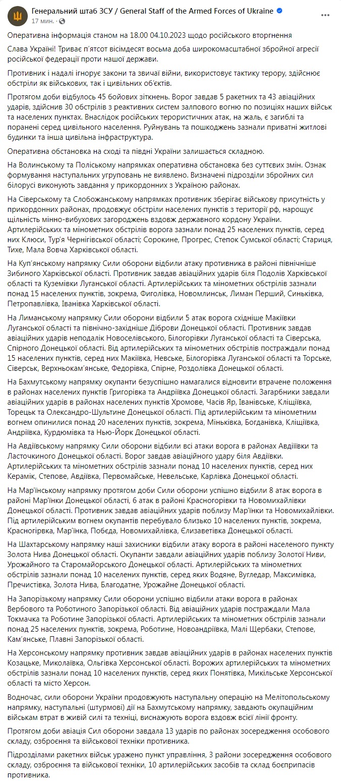 20:03 Нове вечірнє зведення Генштабу ЗСУ.