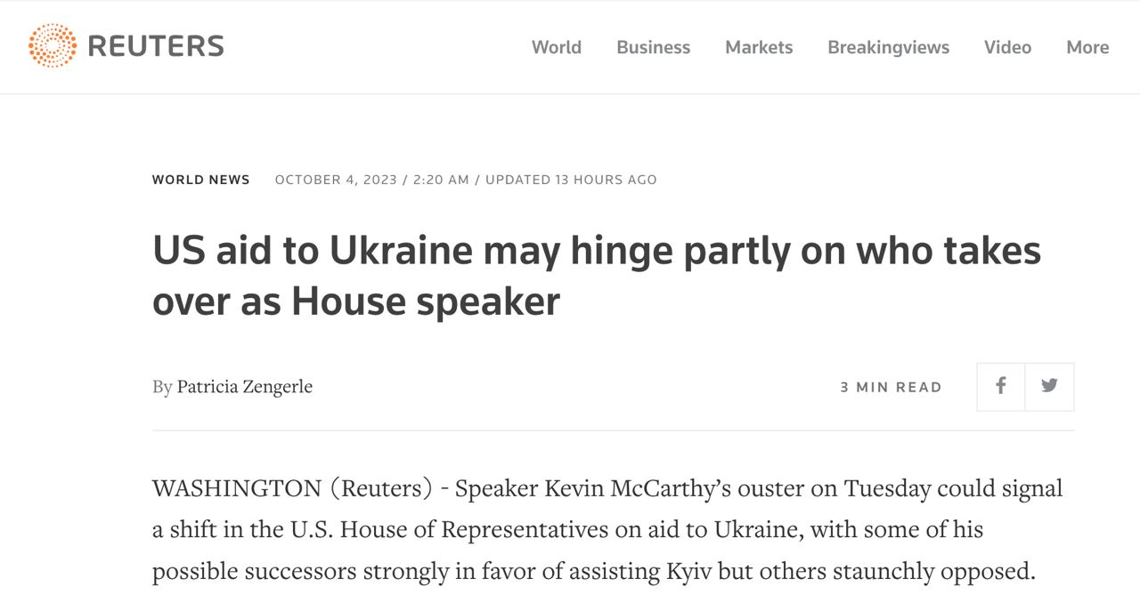 16:25 Американська допомога Україні може залежати від того, хто з конгресменів-республіканців обійме посаду спікера Палати представників, пише Reuters.