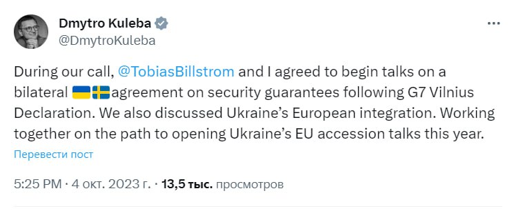 Питання початку переговорів було порушено під час розмови Дмитра Кулеби зі шведським колегою Тобіасом Більстремом.