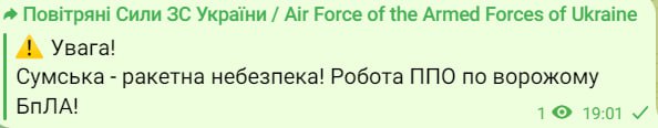 19:02 Ракетна небезпека для Сумщини повідомляють Повітряні сили.