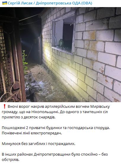 Вночі 4 жовтня росіяни накрили артилерійським вогнем Мирівську громаду Нікопольського району Дніпропетровської області.