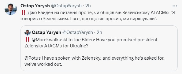 Президент США Джо Байден, відповідаючи на запитання журналістів, чи пообіцяв він президентові України Володимиру Зеленському передати далекобійні ракети ATACMS, заявив, що він говорив з українським колегою, і США вирішили все, що він просив.