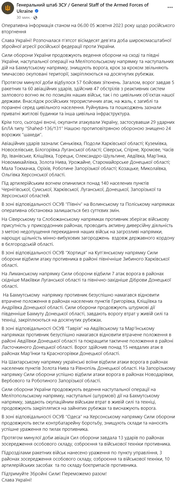 Минулої доби сталося 57 бойових зіткнень. Російські війська ворог завдали 5 ракетних та 60 авіаційних ударів, здійснили 47 обстрілів з реактивних систем залпового вогню за позиціями наших військ та цивільними об'єктами нашої держави.