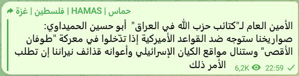Про це заявив генеральний секретар бригад "Хезболла" в Іраку Абу Хусейн Аль-Хамідаві. Це повідомлення було опубліковано в телеграм-каналі ХАМАС.