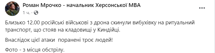 "Близько 12:00 російські військові з дрону скинули вибухівку на ритуальний транспорт, який стояв на цвинтарі в Кіндійці", - написав Мрочко.
