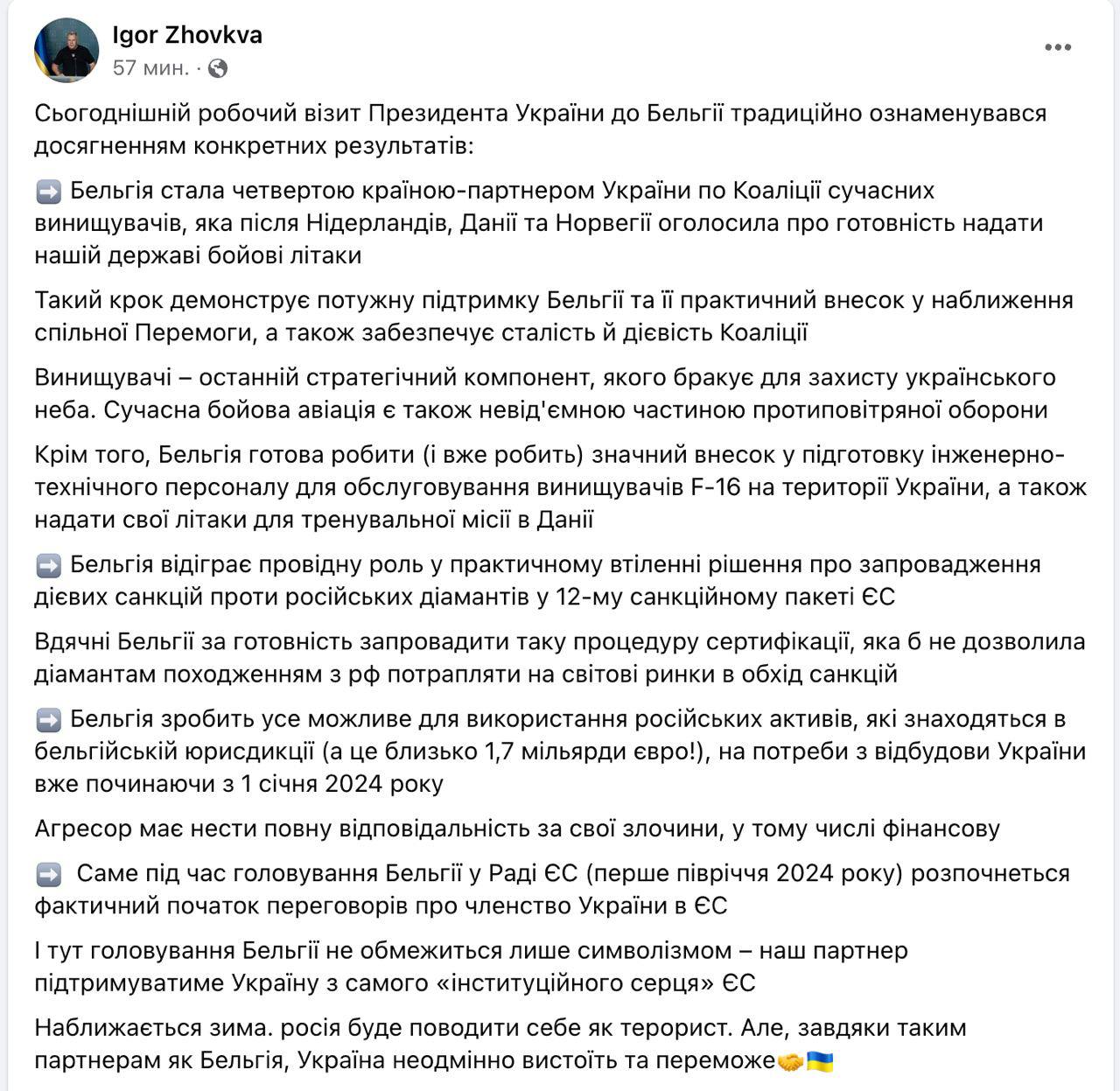 Про це написав у Фейсбуці заступник глави офісу президента Ігор Жовква за підсумками зустрічі Володимира Зеленського з прем'єр-міністром Бельгії Олександром Де Кроо.