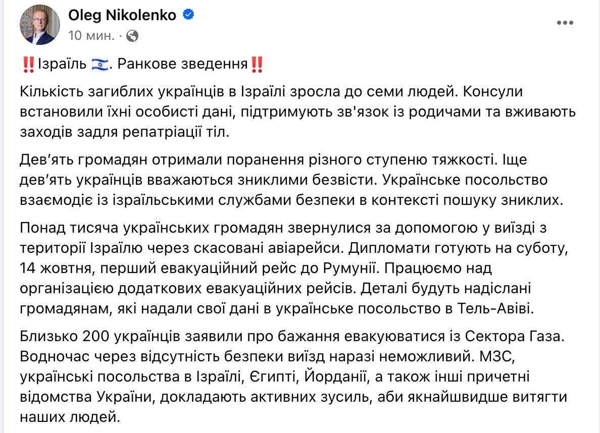 Дев'ять громадян поранено, ще дев'ять вважаються зниклими безвісти. Їх шукають у співпраці із ізраїльськими службами безпеки. Вже понад тисячу українців хочуть, але не можуть відлетіти з Ізраїлю через скасовані авіарейси. На суботу готується перший евакуаційний рейс до Румунії.