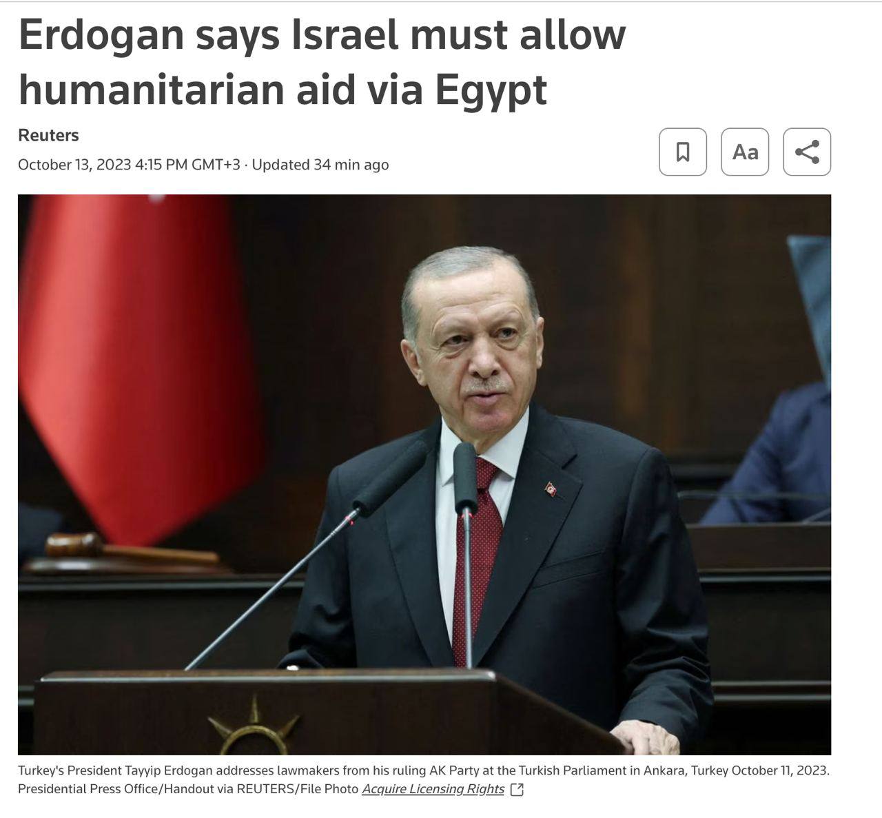 Він закликав Ізраїль дозволити доставку гуманітарної допомоги до сектору Газа через єгипетський контрольно-пропускний пункт Рафах. Напередодні до Єгипту прибув перший літак із турецькою допомогою.