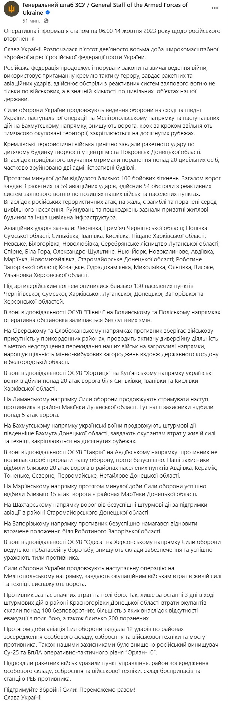 Війна в Україні триває вже 598-й день. Ми стежимо за останніми новинами та ключовими подіями 14 жовтня 2023 року в онлайні, що оновлюється.