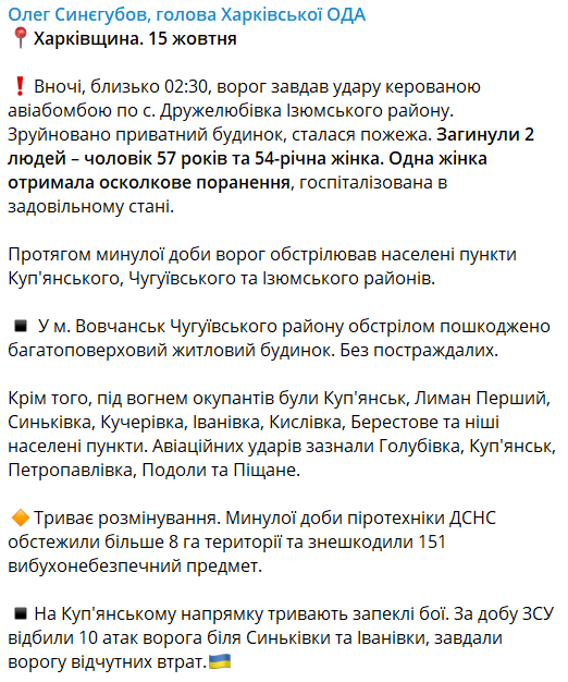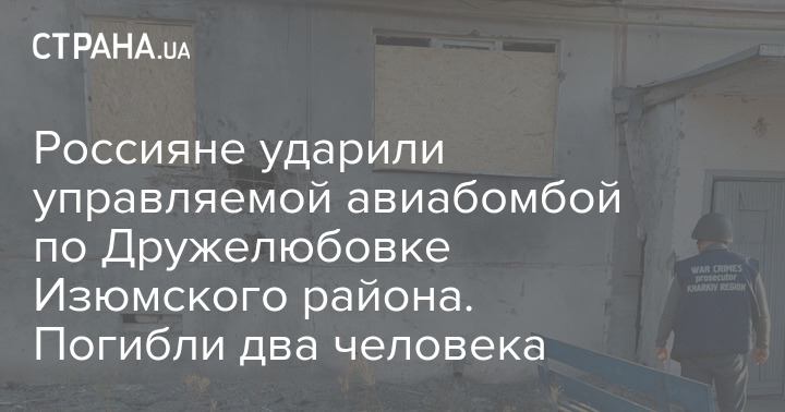 "Вночі, близько 02:30, ворог завдав удару керованою авіабомбою по с. Дружелюбівка Ізюмського району. Зруйновано приватний будинок, сталася пожежа. Загинули 2 людини - чоловік 57 років і 54-річна жінка. Одна жінка отримала осколкове поранення, госпіталізована в удов. ", - написав Синегубов.