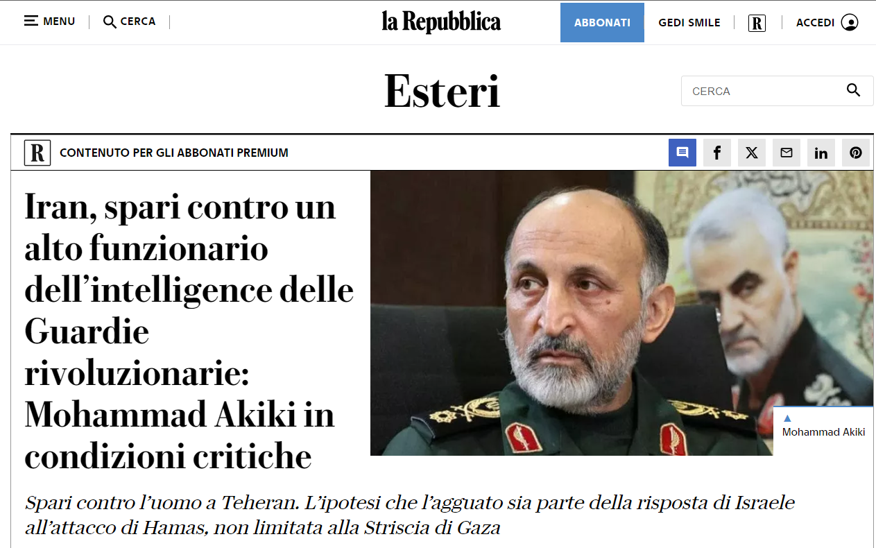 У Тегерані скоєно замах на високопоставленого офіцера розвідки Корпусу вартових Ісламської революції Мохаммада Акіки.