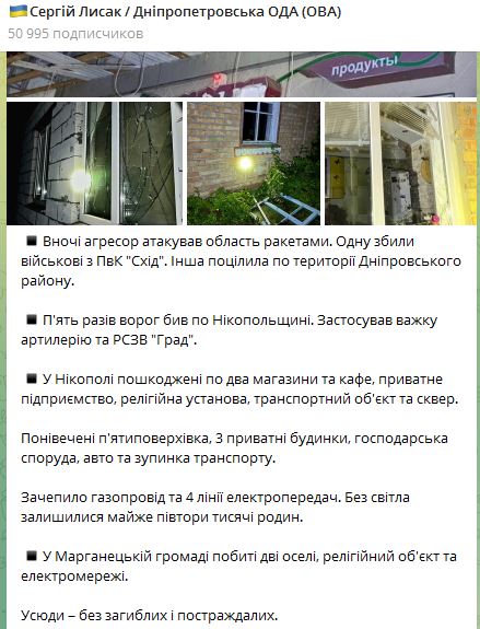 П'ять разів ворог бив по Нікопольщині. Застосував важку артилерію та РСЗВ "Град".