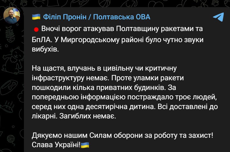 "Попадань у цивільну чи критичну інфраструктуру немає. Однак уламки ракети пошкодили кілька приватних будинків. За попередньою інформацією постраждали троє людей, серед них одна десятирічна дитина", - заявив глава області Філіп Пронін.