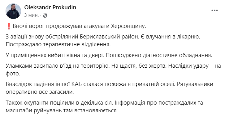 "З авіації знову обстріляно Бериславський район. Є потрапляння до лікарні. Постраждало терапевтичне відділення. У приміщеннях вибито вікна та двері. Ушкоджено діагностичне обладнання", - написав Прокудін.