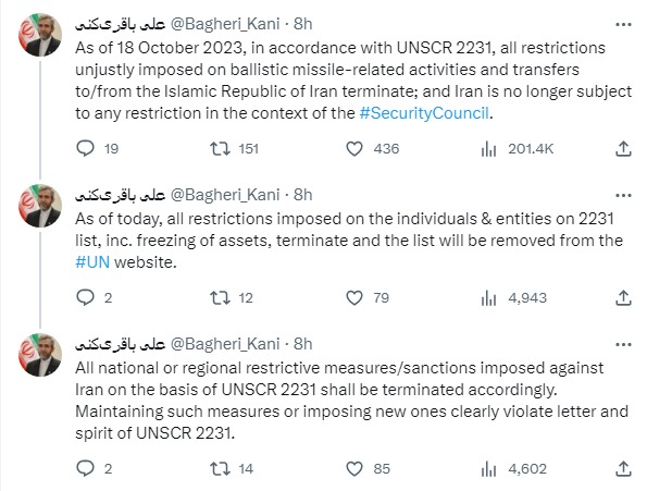 "На сьогодні всі обмеження, накладені на фізичних та юридичних осіб, згаданих у резолюції 2231, у тому числі положення про заморожування іранських активів, завершують свою дію, і їх список буде видалено з сайту ООН. Також втрачають силу санкції, несправедливо накладені на імпорт та експорт балістичних ракет до та з Ірану. Усі національні та регіональні обмеження, введені проти ісламської республіки на підставі резолюції 2231, також мають бути скасовані. Збереження у силі цих заходів прямо порушує положення самої резолюції", - написав Багері Кяні.