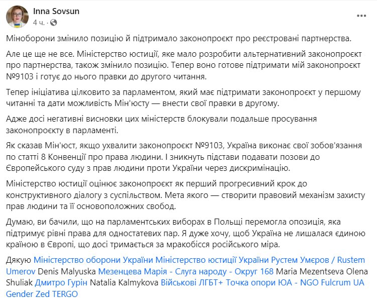 "Міноборони змінило позицію та підтримало законопроект про зареєстроване партнерство. Але це ще не все. Мін'юст, який мав підготувати законопроект про альтернативне партнерство, теж змінив свою позицію. Тепер готовий підтримати мій законопроект №9103 і готує до нього поправки у другому читанні", – написала депутат.