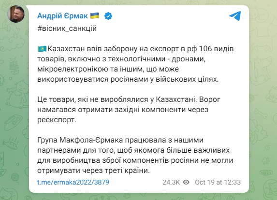 Дії Казахстану прокоментував у своєму телеграм-каналі глава Офісу президента Андрій Єрмак.