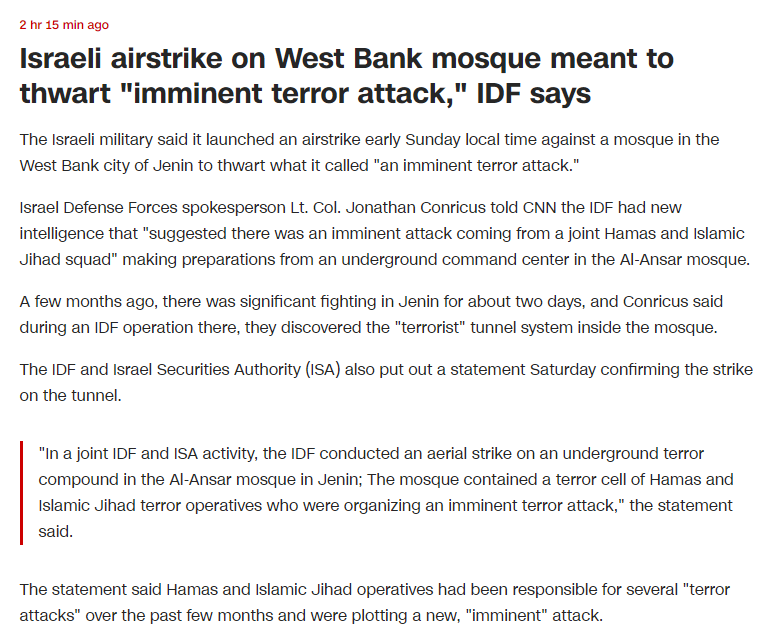 Ізраїльські військові заявили, що рано-вранці в неділю завдали авіаудару по мечеті в місті Дженін на Західному березі річки Йордан, щоб запобігти "неминучій терористичній атакі".