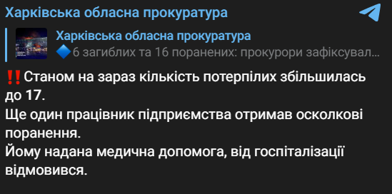 Також у прокуратурі повідомили, що кількість постраждалих збільшилась до 17 осіб. Ще один працівник підприємства отримав уламкові поранення.