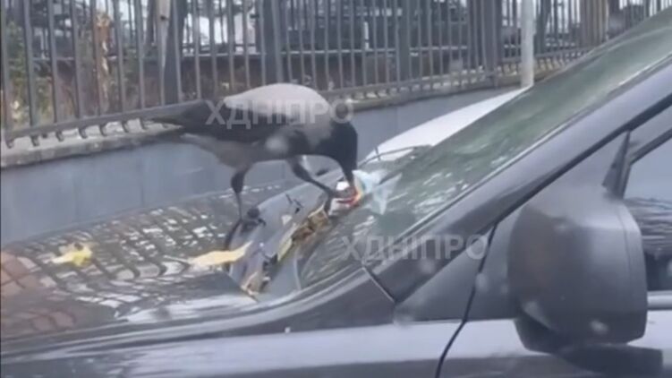 На кадрах видно, як птах злітає на капот припаркованого автомобіля, де на лобовому склі у целофановому пакеті було залишено квитанцію на штраф.