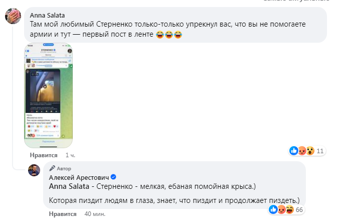 У коментарях Арестовичу повідомили, що Стерненко дорікнув йому, що він не допомагає армії. У відповідь Арестович різко висловився на адресу Стерненка.
