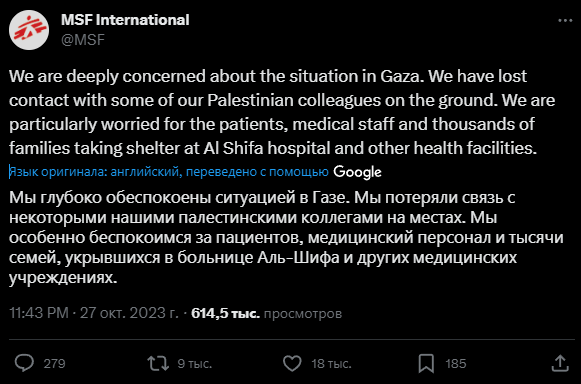 Організація "Лікарі без кордонів" повідомила про втрату зв'язку зі співробітниками на своїй сторінці в соцмережі X: "Ми глибоко стурбовані ситуацією в Газі. Ми втратили контакт із деякими нашими палестинськими колегами на місці подій".