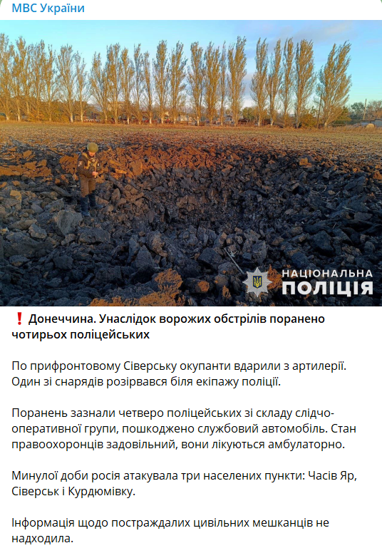 14:25 Внаслідок обстрілу РФ на Донеччині поранено чотирьох поліцейських. По прифронтовому Сіверську окупанти вдарили з артилерії, один із снарядів розірвався біля екіпажу поліції
