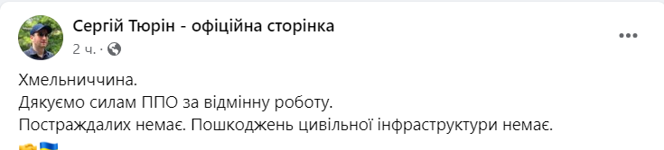 "Дякую силам ППО за відмінну роботу. Постраждалих немає. Пошкоджень цивільної інфраструктури немає", - написав він.