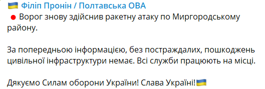 07:51 Вночі Росія завдала ракетного удару по Миргородському району Полтавської області.