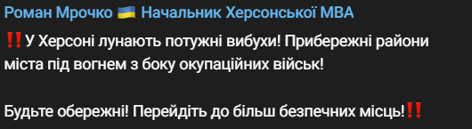 07:57 Сьогодні вранці у Херсоні було чути потужні вибухи, повідомив керівник ГВА Роман Мрочко. Під обстрілом прибережні райони міста.