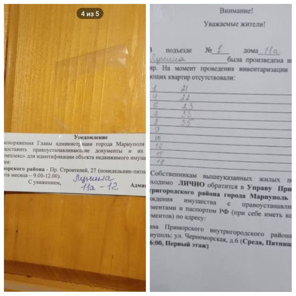 Ось як виглядає повідомлення про "безгоспність" житла на прикладі Маріуполя. На дверях вивішується повідомлення, що власнику житла необхідно з'явитися в "органи влади" протягом 30 днів, щоб довести право на володіння житлом.