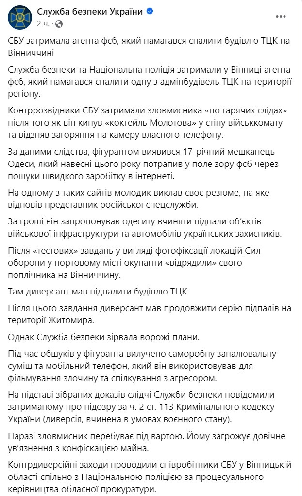 Служба безпеки України затримала у Вінницькій області агента ФСБ РФ, який кинув коктейль Молотова в будівлю ТЦК.