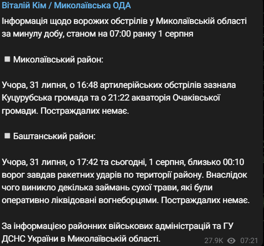 07:53 Росіяни завдали двох ракетних ударів по Миколаївській області, повідомив губернатор Віталій Кім.
