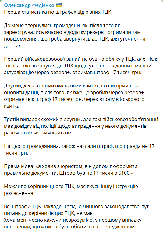 "Перший військовозобов'язаний не був на обліку до ТЦК, але після того, як він звернувся до ТЦК щодо уточнення даних, маючи актуалізацію через резерв+, отримав штраф 17 тисяч грн.