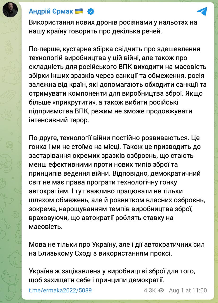 11:08 Голова ВП Андрій Єрмак підтвердив, що Росія почала використовувати нові дрони.
