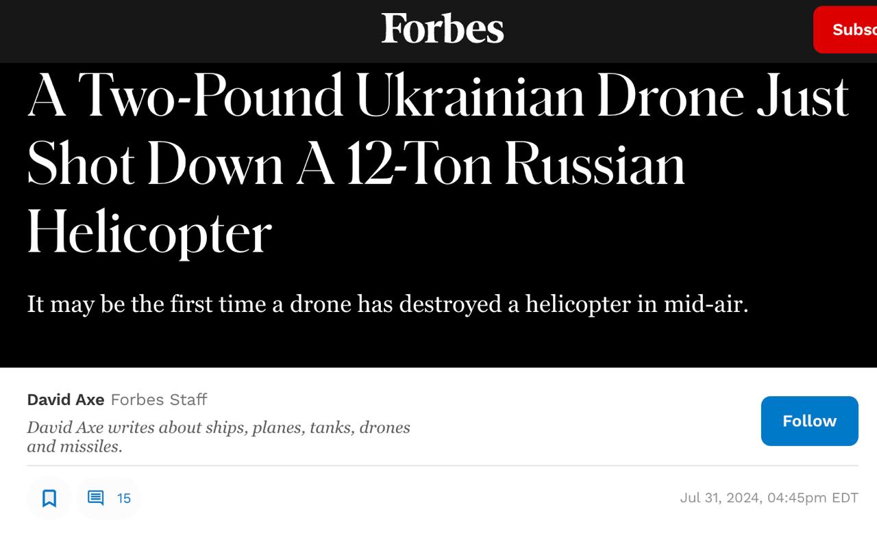 12:03 Ймовірно, ЗСУ вчора вперше вдалося збити російський гелікоптер у повітрі за допомогою дрону, пише Forbes.