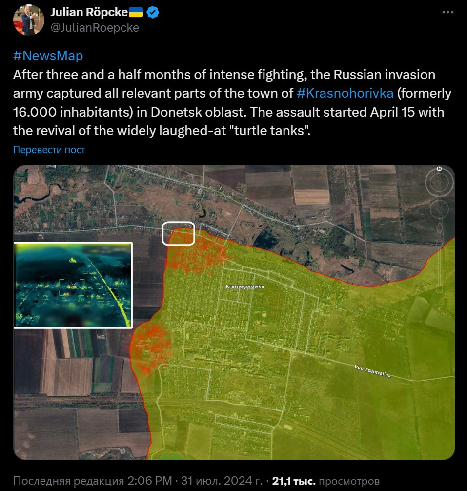 "Після трьох з половиною місяців інтенсивних боїв російська армія вторгнення захопила всі відповідні частини міста Красногорівка (раніше з населенням 16 000 жителів) у Донецькій області. Наступ почався 15 квітня з відродження "танків-черепів", що широко обговорюються, - написав журналіст у Х і картку.