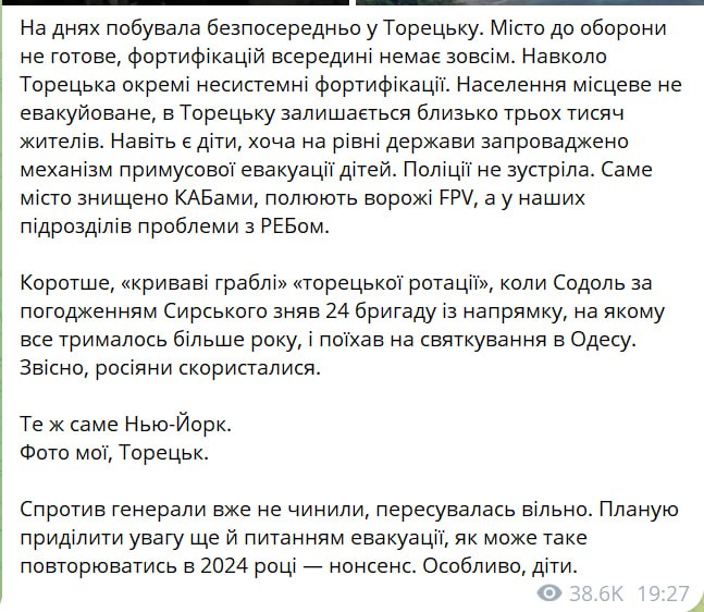 "Місто до оборони не готове, фортифікацій усередині немає зовсім. Навколо Торецька окремі несистемні фортифікації. Населення місцеве не евакуйоване, у Торецьку залишаються близько трьох тисяч осіб. Навіть є діти, хоча на рівні держави запроваджено механізм примусової евакуації дітей. Поліції не зустріла. Сам місто знищене КАБами, полюють ворожі FPV, а у наших підрозділів проблеми з РЕБом. Коротше, "криваві граблі" "торецької ротації", коли Содоль за погодженням Сирського зняв 24-ту бригаду з напрямку, на якому все трималося більше року, і виїхав на святкування до Одеси. Звичайно, росіяни скористалися", – написала Безугла.